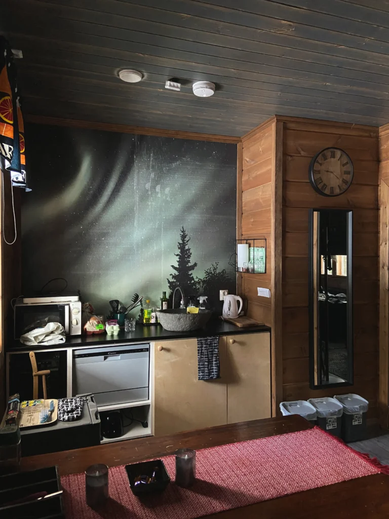 Wir hatten uns vorgestellt in einer kleinen urigen Holzhütte zu übernachten. Und so verbrachten wir die ersten drei Nächte in dem Gästehaus mit Sauna in Sodankylä, ungefähr 1 1/2 Stunde entfernt von Rovaniemi. Weit entfernt von der Stadt und inmitten der finnischen Wäldern haben wir genau das gefunden, was wir wollten: Natur und Ruhe pur. Morgens sind wir mit dem Tageslicht aufgewacht, tagsüber haben wir Ausflüge gemacht und am Abend haben wir in der traditionellen finnischen Sauna ordentlich geschwitzt. Bevor wir ab 22 Uhr Schneeschuhwandern und auf Polarlichter-Jagd gegangen sind.