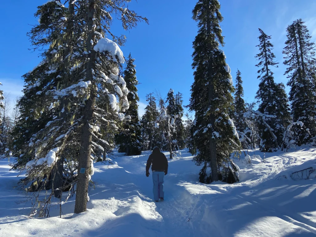 Ein weitere schöne Unternehmung, um die wunderschöne Landschaft Lapplands zu genießen, ist Schneeschuhwandern zu gehen. Viele Unterkünfte stellen Schneeschuhe bereit. Wir sind im „Lappland Ski Resort Luosto“ wandern gegangen.