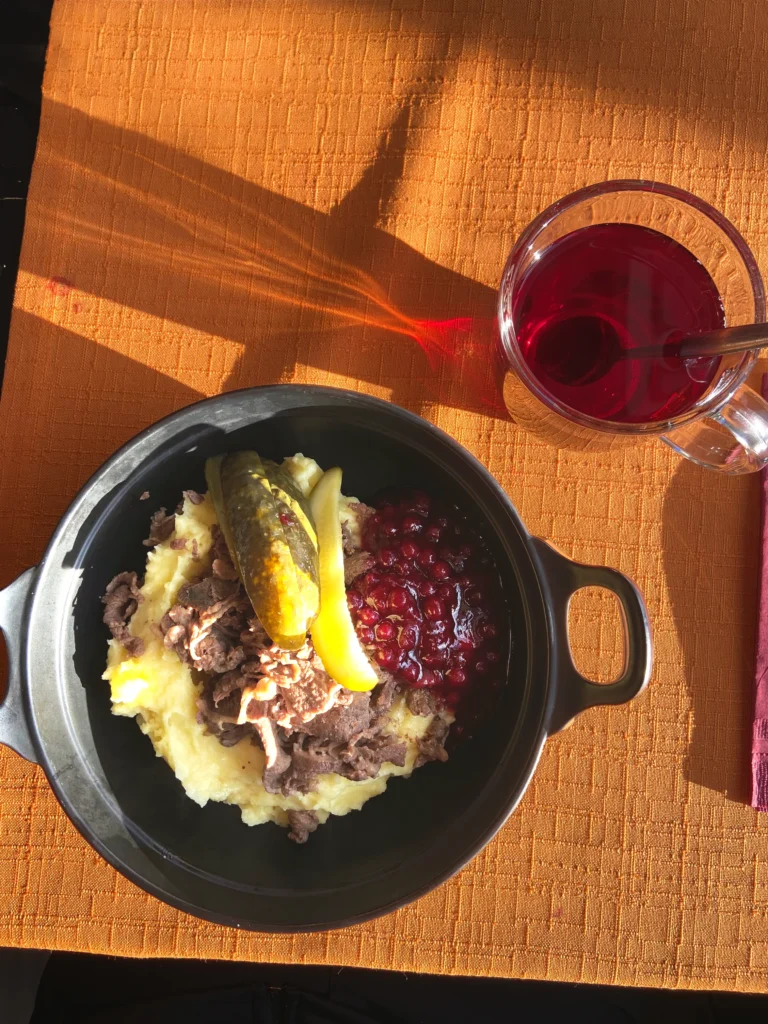 - Poronkäristys – Gebratenes Rentierfleisch mit Kartoffelpürree und Preiselbeermarmelade