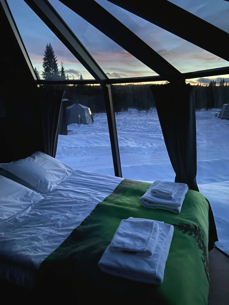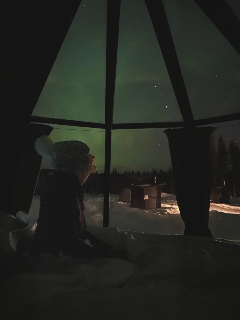 Das Highlight unseres finnischen Wintermärchens war definitiv die Übernachtung in einem Glasiglu. Das Iglu war recht klein, aber modern ausgestattet. Es ist auf jeden Fall ein Erlebnis, was du dir nicht entgehen lassen solltest. Viel geschlafen haben wir nicht, so viel können wir schon mal verraten. Zwischen dem Saunieren in der privaten Sauna und dem nächtlichen Bestaunen der Polarlichter blieb nicht viel Zeit zum Schlafen übrig. Außerdem waren wir auch noch damit beschäftigt unsere Hauscloggs zu suchen. Denn als wir schön in unserer Sauna saßen, kam auf einmal ein Schneesturm und wehte unsere Schuhe weg, die wir draußen gelassen hatten. Als wir den Sturm mitbekommen haben, war es schon zu spät. Nach dem Saunieren musste sich jeder von uns mit einem Schuh begnügen, der jeweils andere wurde weggeweht und war nicht mehr aufzufinden. Also insgesamt ist eine Übernachtung in einem Glasiglu ein tolles Erlebnis. Auch das Frühstück in der Finnhütte, in der Kaffee und warme Speisen über dem Feuer zubereitet werden, war sehr gut.
