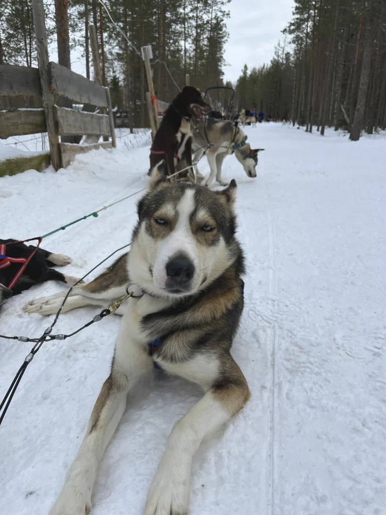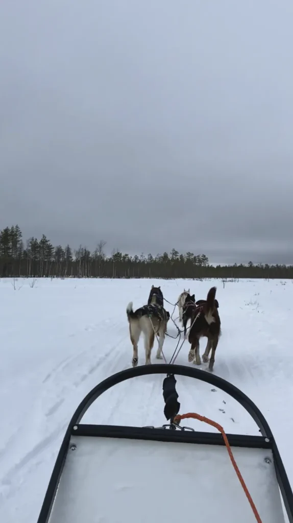 Was wir in Finnisch Lappland unbedingt machen wollten, war eine Husky-Tour. Es gibt viele Anbieter. Es war auf jeden Fall ein tolles Erlebnis. Die Gruppe bestand aus fünf bis sechs Pärchen, die jeweils einen Schlitten mit fünf Huskys fuhren. Dabei fährt eine Person den Schlitten und die andere sitzt vorne und kann die winterliche Landschaft genießen. Nach der halben Strecke wird gewechselt. Die Huskys sind wirklich schnell. Wenn wir anhalten sollten, musste ich mich mit meinem gesamten Gewicht auf den Schlitten stellen, ansonsten wären die Huskys weiter gerannt und der Schlitten hätte wohl nicht angehalten.